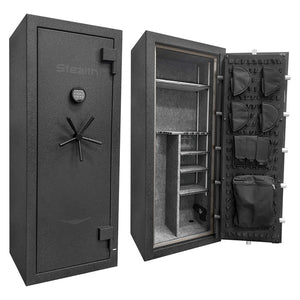 The Stealth UL23 Gun Safe boasts a 23-gun capacity and meticulous design, standing at 59.00" high by 24.00" wide by 18.00" deep. It's tailored to fit seamlessly in your closet, ensuring your firearms and valuables remain secure and easily accessible.