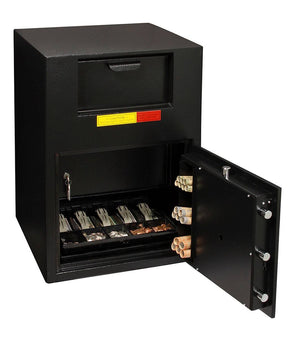 The interior locker (where the drops go) boasts a 1/4" door with a Medeco high security lock. That locker is a full 6" x 19.5" x 14" so you have plenty of room for those drops. The front load hopper is protected by anti-fish baffles both top and bottom.