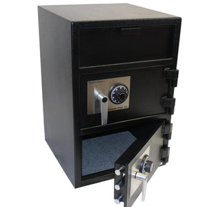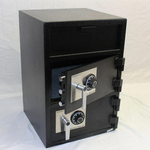 The SafeandVaultStore HPD3020DD is a wide body double door depository safe made from solid steel. It is designed with strength and security in mind to protect your drops and deposits. Both doors feature 1/2" solid steel thickness which gives this safe a "B" classification for burglar protection. This safe features two chambers. The top chamber is designed for all your drops and deposits and is 7" H x 19.63" W x 17" D. The bottom compartment can be used for spare change and your cash trays from your tills. The inside measurements of this compartment are 11" H x 19.63" W x 17" D. This way you only need one safe to protect everything vs buying two different safes.
