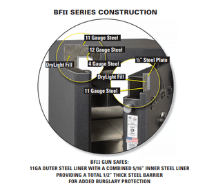 The dual-shelled body of the AMSEC BFII6032 gun safe features proprietary DryLight concrete insulation, not gypsum board. Its door consists of a 1/2" steel plate combined with 2 inches of DryLight insulation. This construction forms a solid theft barrier that thwarts outside attacks and stands up to a fire.