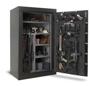 The body is constructed of 12 gauge solid steel with a 3-5/8 inch recessed door that includes 3/16" inch solid steel with fire insulating material. This AMSEC 36 gun interior burglar and fire gun safe is equipped with AMSEC's ESL5 electronic lock with illuminated keypad. Protecting those important guns and contents is a system of 4-way bolt work that has a total of 14 1-1/4" diameter chrome-plated steel bolts. That's a lot of protection for the price. There are 4 anchor holes in the bottom of the safe that when used will provide additional theft protection. There is also pre-cut electrical access in the rear of the safe