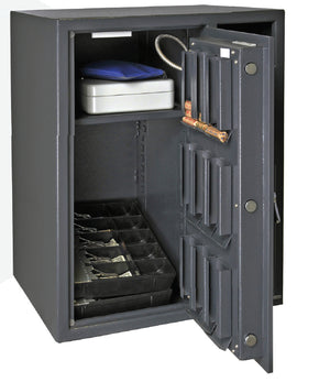 The AMSEC RMM3214ESLAudit-R 2 Door Cash Management Safe comes with AMSEC's highly touted ESLAudit II Audit Trail Lock. It has some great security features including support for 3 types of users such as PIN only, e-key and PIN/e-key, dual control mode, armored car bypass, holiday schedule, and more. It will store up to 5,000-record audit trails so you can see who got into the safe and at what time. It also allows you to program up to 40 users, each configurable with unique privileges. The ESLAudit II Electronic Lock will allow you to control both doors with one lock. You can give certain employees access to one door but not the other depending on how your business is setup.