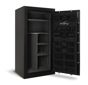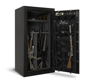 The AMSEC SF6030E5 Gun Safe with its changeable interior (15 long guns with shelves or 30 long guns with no half shelves) always has a full-width top shelf. The back door cover and the fire walls are covered in a rich velour while the shelves are a durable American Oak wood laminate finish. Again, that is a lot of features for the money. Oh yes, there are also external hinges that allow the door to swing 180 degrees for full access to the interior. The easy-to-clean black textured finish on this Fire and Theft Resistant Gun Safe by AMSEC adds even more value.