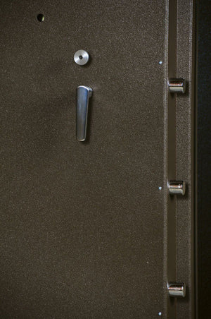 The AMSEC VD8030BFQIS Security Room In-Swing Door has many features that include ten massive 1-1/2" bolts that when activated fit into a reinforced door jamb to resist prying and forcible entry. The door is painted in a textured finish of your choice along with a five (5) spoke handle. The door also has a spy-proof dial and three-number combination lock. Electronic locks are available and are an additional cost option. There is also elegant scrollwork on the outside of the door