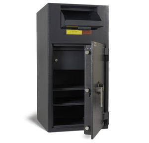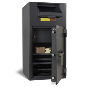 This Cash Management Deposit Safe offers all the standard security features of our other deposit safe including an ESL10 Digital Lock protected by a large carburized steel hardplate. There is also three-way (top, side, and bottom) bolt work that works with the bolt detent system to lock the bolts in place while the door is closed.