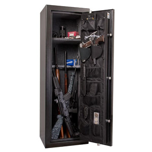 The AMSEC TF5517E5 is the perfect closet-sized gun safe, designed for small spaces. The outside dimensions are 55.25" H x 17.34" W x 16.00" D. If you live in an apartment or condo, this gun safe might be the one for you. The door features a 3/16" steel plate with 2 layers of fire insulating material. The body consists of a 14-gauge solid steel plate with fire insulating material.
