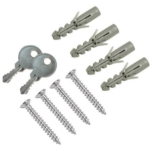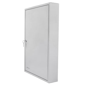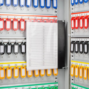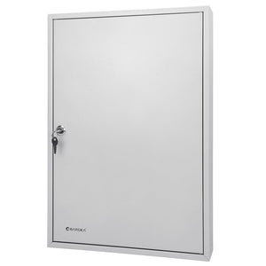 The CB12956 100 Position Key Lock Box from Barska features a hook-style cabinet that makes key organization easy and convenient. Inside the cabinet are five rows of color-coded and numbered hooks, each of which is easy to access and keep track of thanks to the included key index. The two-sided indexing chart has ample room to document the keys hook position corresponding lock, and a drop-in plastic sleeve tethered to the hinge inside the safe provides a hands-free reference.The safe has our pre-drilled mounting holes and included hardware for installation.The safe walls and door are constructed of 0.8mm solid steel and finished with a gray coating.