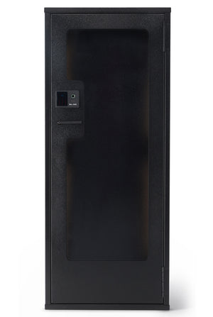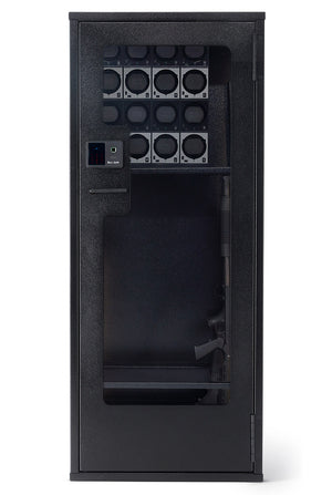 The BlumSafe Secure Display Cabinet combines heavy-duty American-made quality with advanced security features to protect and showcase your watches and valuables. Constructed from durable 14-guage steel, it employs a patent-pending vertical beam with an innovative 8-point locking system that goes beyond traditional mechanisms. The locking carriage, reinforced with eight slots, is positioned on end and fully supported to prevent bending, neutralizing pry attacks with ease. The lock is shielded by a single-layer hardplate, further enhancing the safe's defense against tampering.