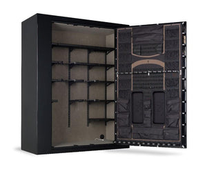 This spacious 27.09 cubic foot gun safe is an extra-wide gun safe to store rifles. It has a large interior that can handle up to 65 of your long guns, several handguns, your jewelry, your documents, and other important papers. It has dimensions of 60 inches H x 57 inches W x 26 inches D allow it to be placed in almost any room as it does not take up a lot of front to back space.