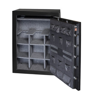 The Gardall BGF-6040 will hold up to 39 rifles without scopes. It also features a NEW Premium Quality Door Organizer on the door as a standard feature. This redesigned full-length door organizer offers extra capacity for ammo and pistols. There is a 5 spoke handle to open the door available in gold or silver trim package. Other security features include 9 active 1-1/2" bolts to prevent pry attacks as well as 3 - 1-1/2" deadbolts on the hinge side. There are 4 anchor holes on the bottom to bolt to a sold surface (highly recommended). The outside of the BGF-6040 is painted with a heavy-duty black powder-coated (matte paint).
