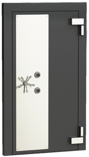 The Hamilton UL-1 Hyde Park Vault Door has a standard clear opening of 80.00" high by 36.00" wide. The masonry opening is 87.50" high by 50.00" wide. The outside features a maintenance-free stainless steel construction and is painted a powder-coated charcoal gray finish. There are five locking bolts and a full-length deadman bar to prevent pry attacks on the door. There are two four wheel UL listed Group 2M mechanical dial combination locks plus a UL-listed three-movement time lock that is 144-hour resettable. Other lock options include a Group One combination lock or a high-security electronic lock.