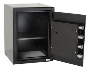 If you value top security for your jewelry, cash, passports, and other precious items, consider the possibilities and security protections the Hayman CV-20-C has to offer. Made from solid steel and containing a 1/2" thick solid steel door this safe is designed to protect what matters to you at all costs. It has a hardened drill cover plate that will thwart any drilling attempt. A spring-loaded relocking mechanism protects the safe from forced entry attempts made against the lock or door of the safe. This safe has a totally reinforced door frame which is perfect for resisting crowbars and pry attempts. This burglar safe also has an auto locking system which will allow the bolts to seal into place when the door is shut.