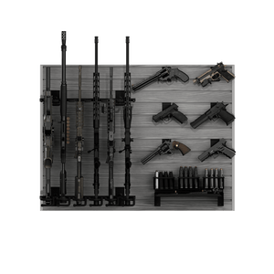 This bundle is designed to hold up to six long guns, six pistols, and twelve magazines, with the included heavy-duty steel shelf providing space for ammo, optics, or additional gear. As your collection grows, you can seamlessly add additional panels and accessories.