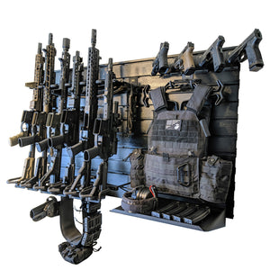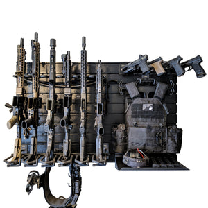 The Hold Up Displays HD90 Gun Wall Bundle is a modular wall-mounted storage system that securely organizes and displays firearms in a compact, efficient layout. Built to accommodate six rifles and six pistols, this system works with tactical and hunting rifles, semi-automatic pistols, and revolvers, keeping everything visible, accessible, and properly supported.