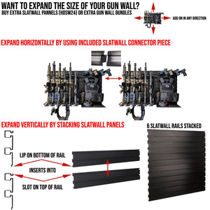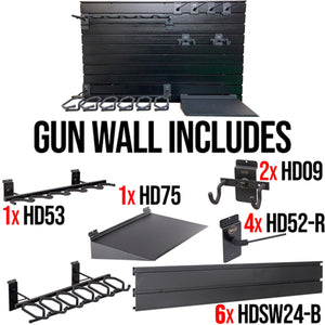 CLICK HERE to watch our video on “What to Do When Your Safe Arrives.”The Hold Up Displays HD90 Gun Wall Bundle is a modular wall-mounted storage system that securely organizes and displays firearms in a compact, efficient layout. Built to accommodate six rifles and six pistols, this system works with tactical and hunting rifles, semi-automatic pistols, and revolvers, keeping everything visible, accessible, and properly supported.