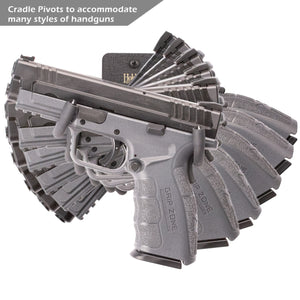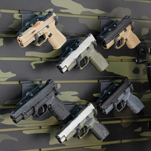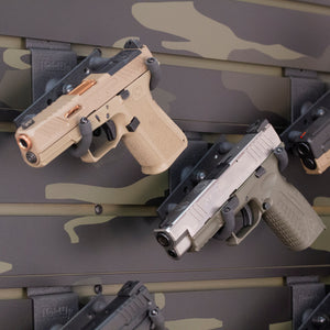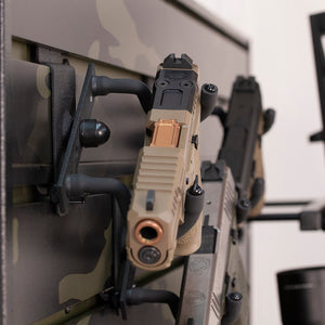 The HD09 wall-mount pistol holder from Hold Up Displays is designed to securely hold any pistol or revolver. It can be positioned at any angle to display your firearm properly. These can be configured for use with Hold Up Displays 3" slatwall panels or to be mounted directly to your wall with the flatwall option.
