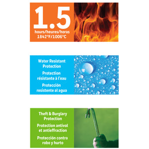 The Honeywell 2120 water resistant steel fire and security safe 90 minute fire rating is tested up to 1842 degrees F. It also features a water resistant door and cabinet design. The door is protected by a dual digital and key lock. The lock is an advanced dual user lock with an emergency key override access in case the batteries die or you forget your combination. The LCD display panel is easy to read and there is a programmable calendar and clock with a motion and tilt alarm. There is a user history log to see who has entered the safe. The security on the Honeywell 2120 features 4 solid steel live lock bolts and double steel wall construction.