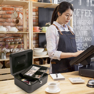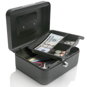 Inside, you'll find a removable 3-compartment tray, ideal for organizing coins, bills, or event tickets. Underneath, there's extra storage space for checks, receipts, or larger bills. It’s a practical, easy-to-carry portable money box built with a strong steel construction and a scratch-resistant powder coat finish that holds up over time.