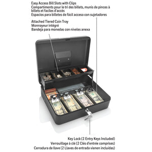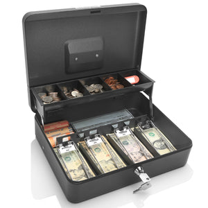 Honeywell's 6213 all steel tiered cash box is the perfect solution for your cash management needs. There is a 5-compartment tiered coin tray which allows for larger storage capacity when the tray is lifted. There is also 4 bill compartments with clips for organization of your cash. The outside is locked by a key lock with 2 entry keys included. The outside is painted a scratch-resistant powder coat finish for a lifetime of use. A convenient carry handle will allow you to easily carry around if needed. Honeywell includes a 1 year limited warranty with the 6213.