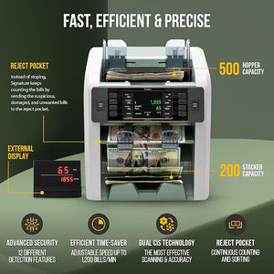 The Kolibri Signature 2-Pocket Mixed Bill Counter holds up to 500 bills in its hopper and 200 bills in the stacker, with an adjustable speed of counting up to 1,200 bills per minute. Equipped with advanced counterfeit detection technologies, including 2 CIS, UV, MG, and IR, it effectively prevents counterfeit bills, saving you money over time. Plus, it's backed by a three-year warranty and free lifetime technical support. For any questions, call us at 800-207-2259 today!