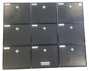 Each PVB-5813 is sold individually and features predrilled mounting holes, making it easy to securely bolt the box to any solid surface. A key-operated cam lock with two included keys keeps contents secure, and the durable black powder-coat finish resists wear and corrosion over time. These stackable pistol boxes are commonly used by law enforcement agencies, military, and institutional facilities, and multiple units can be welded together into a cluster upon request. Proudly made in the USA, the PVB-5813 delivers practical, long-lasting firearms storage you can trust.