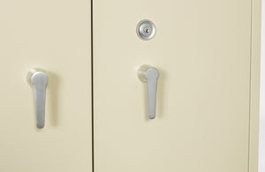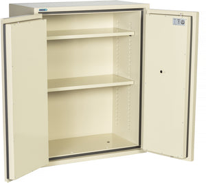 There are two doors on the Phoneix FRSC326 Fire Fighter 90 Minute Fire Rated Storage Cabinet. They are locked by a pick-resistant, seven-pin, dimple key lock. Included are 2 shelves inside that are adjustable. Extra shelves can be added for an additional charge. There are optional accessories including a side tab filing system and STF Dividers.