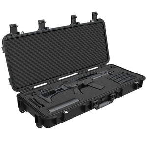 The PP-11140 Weatherproof Hard Rifle Case with Customizable Foam Insert is pre-drilled for two padlocks (not included). These locks keep your contents secure and would require someone to defeat both locks to get access. An adjustable pressure relief value equalizes pressure for easy opening. This allows you to equalize the pressure so you can open the case after changing elevations. The inside features pick-and-pull foam insert to absorb impacts and protect your firearms. For ease of transportation, this case has two strong wheels which allows you to roll it instead of having to carry it.