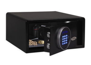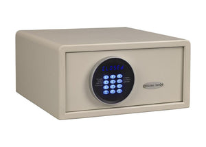 The electronic digital function, ADA compliant illuminated keypad is fully motorized with two locking bolts. It also features a bright LED display so that you can see the combination in the dark. Another great feature is the audit-trail functionality provided by the optional CEU. This allows you to see who got into the safe. The hotel safe can be opened using the electronic override via micro-USB & or the optional mechanical key. The outside is painted with an electrostatic powder coat paint finish.