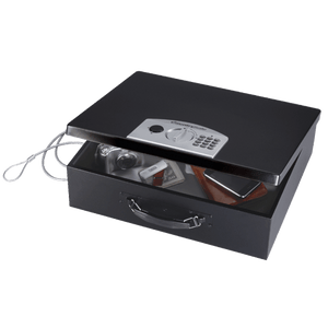 Ideal for on the go protection, the SentrySafe PL048E electronic laptop safe will provide protection for a laptop or tablet as well as cash, jewelry and passports. This laptop safe comes with an electronic lock with a key override for quick access. It has a steel cable attached so you can mount it to any solid surface to prevent theft of the unit. It is made from durable solid steel which will provide durability during travel. A soft interior padding keeps items from being scratched or banged up during travel. You can store up to 2 codes for authorized access control. This laptop safe is ideal for students who want to protect their laptop or tablet as well as some valuables while they are away from their dorm room. Get the peace of mind in your dorm room. Order the PL048E today.
