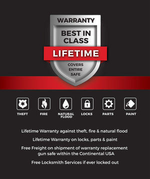 We stand behind products with a Best-in-Class Lifetime Warranty, which covers the safe against theft, fire, natural flood, locks, parts, and paint. We offer free freight on warranty replacement gun safes in the continental USA and free locksmith services if you ever get locked out.