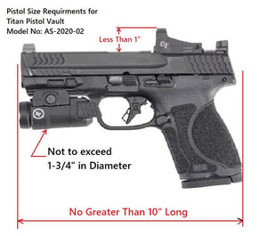 Ensure your firearms are safely secured and quickly accessible with the Titan Pistol Vault. For any custom requirements, such as accommodating a red-dot sight, please contact us when placing your order.