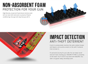 • ADVANCED ANTI-THEFT PROTECTION featured on all Vaultek safes includes anti-pry bars, Dual anti-impact latches, interior mounted hinges, and NEW IMPACT DETECTION exclusive to VTi for the ultimate prevention against break-ins.