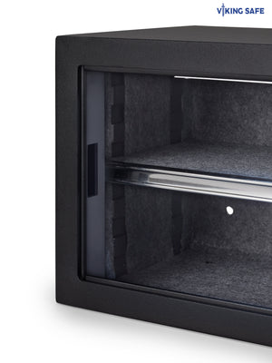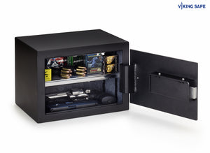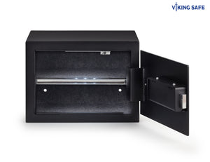 Inside the Viking VS-25SX Multi Handgun Safe is carpeting on all sides to protect your handguns and other valuables from scratches. The outside is painted with a nice-looking black military coating finish. An adjustable shelf will help organize your contents inside. If this safe is installed in a dark room, a LED light comes standard inside to help you see your items in the dark.