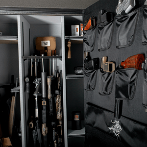 The Winchester Legacy 53 Gun Safe has two durable powder-coated finishes - black or slate. A 5-spoke fluted chrome vault handle is standard on the door. The inside is an upgraded welted pindot interior. Winchester includes a bright white motion-sensing LED light kit. A power docking system provides (2) 110V outlets and (2) USB ports. A deluxe door panel organizer provides quick access to handguns and safe storage of accessories, documents, and more in thermal-protective, zippered pockets.