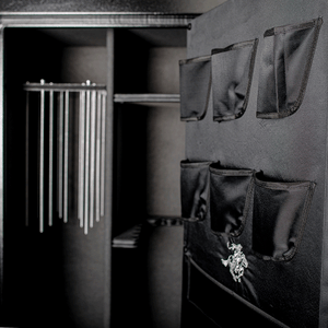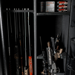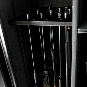 The outside is painted with a durable powder-coated textured slate door with a black body. A 5-spoke black, chrome vault handle is standard. Inside is a Power Docking System that provides (2) 110V outlets and (2) USB ports to plug in items such as a light kit, dehumidifier rod, or other accessories. An adjustable shelving system gives you easy access to your rifles.