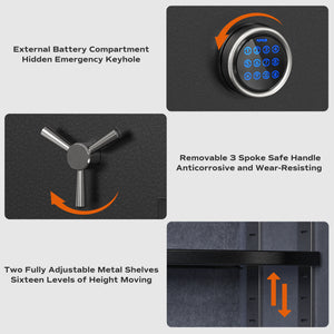 Constructed with anti-theft solid steel and 16mm heat-resistant fire boards, this safe meets the UL 72 standard for fire resistance, offering 30 minutes of fire resistance at outside temperatures up to 1200 degrees F.