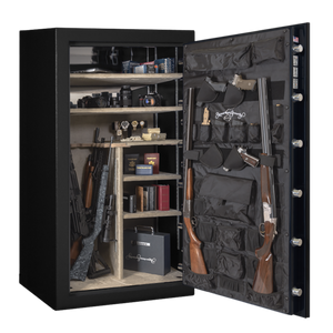 The dual shelled body of the AMSEC fire and theft rated BFII6030 Gun Safe encloses proprietary DryLight concrete insulation eliminating the use of gypsum board and forming a solid theft barrier from outside attacks. The door consists of a 1/2" steel plate combined with 2" DryLight insulation for barrier from attacks and fire. Because of this manner of construction and the fact that it is equipped with a U.L. listed Group II combination lock and protected by massive hard plate means the safe has been awarded the U.L. Residential Security Container (RSC) Level II burglary classification. This safe has a combined steel thickness of 1/2" in body construction. The inner steel has a 12 gauge formed liner plus a 4 gauge plate liner. This adds 359 pounds from the standard safe and is your assurance of quality and protection. In addition, it uses the TL-15 boltwork. It has the same bolt pattern as the AMVAULT TL-15's, 5 active and 5 dead. No top or bottom bolts.