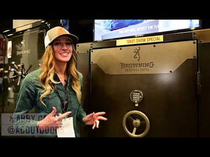 Browning has designed the look of 1878-65T to feel retro. The paint is a stained metal finish and includes an 1878 metal plate graphic. There is also a cast-iron wheel to open and close the safe. Inside features a beige fabric color.