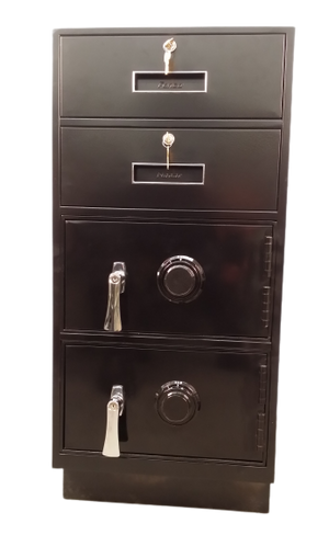 Cash handling is important to any business, especially financial institutions with cash. The Fenco 207FL Pedestal Unit with 2 Locking Box Drawers and 2 Steel Plate Lockers is 38.50" tall and 18.00" wide. Both lockers have 1/4" full lockers behind a 1/2" steel plate doors (B-Rate Burglar Rating), equipped with three-point locking bolt-work, Group 2 Spyproof Mechanical Combination Locks, and Key Locking L-Shaped Handles. Fenco's Goldine 200 Series offers versatility for your teller line, teller pod, back counter, or work room. The top drawers are locked by a key lock.