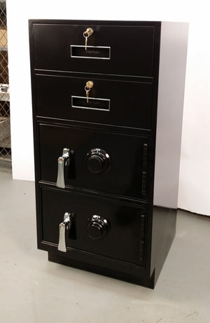 CLICK HERE to watch our video on “What to Do When Your Safe Arrives.”Cash handling is important to any business, especially financial institutions with cash. The Fenco 207FL Pedestal Unit with 2 Locking Box Drawers and 2 Steel Plate Lockers is 38.50" tall and 18.00" wide. Both lockers have 1/4" full lockers behind a 1/2" steel plate doors (B-Rate Burglar Rating), equipped with three-point locking bolt-work, Group 2 Spyproof Mechanical Combination Locks, and Key Locking L-Shaped Handles. Fenco's Goldine 200 Series offers versatility for your teller line, teller pod, back counter, or work room. The top drawers are locked by a key lock.