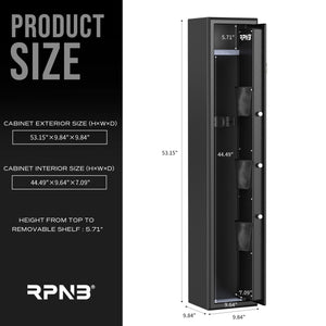 With outside dimensions of 53.15" high by 9.84" wide by 9.84" deep, inside dimensions of 44.49" high by 9.64" wide by 7.09" deep, and interior cubic feet of 1.76, the RPNB RP3FR is large enough to store up to 3 rifles while remaining compact enough to fit in tight spaces.