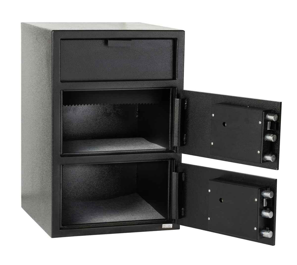 The SafeandVaultStore HPD3020DD is a wide body double door depository safe made from solid steel. It is designed with strength and security in mind to protect your drops and deposits. Both doors feature 1/2" solid steel thickness which gives this safe a "B" classification for burglar protection. This safe features two chambers. The top chamber is designed for all your drops and deposits and is 7" H x 19.63" W x 17" D. The bottom compartment can be used for spare change and your cash trays from your tills. The inside measurements of this compartment are 11" H x 19.63" W x 17" D. This way you only need one safe to protect everything vs buying two different safes.