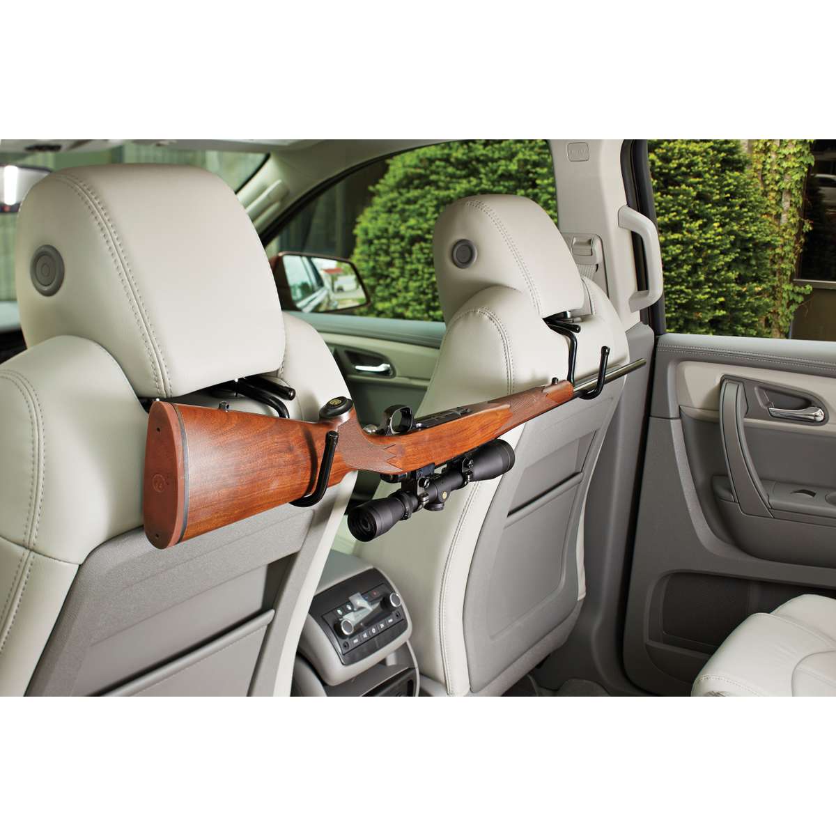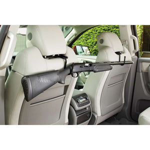 Having a place in your vehicle to secure a long gun is convenient. The SnapSafe 75881 Vehicle Headrest Gun Rack comes in a 2 pack of coated wire hooks. Each hook secures to each headrest (driver and passenger). They hang behind each seat to hold a long gun. Other items that can also hang behind the seat include range bags, clothing, or even grocery bags. This is a great idea for over the headrest rifle storage.