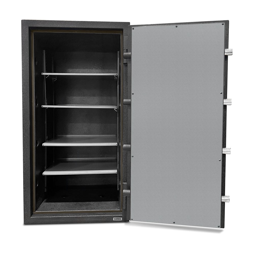 The door is locked on the Stealth CS45 Concrete Composite Burglar Fire Safe with 8 solid steel chrome plated 1-1/4" locking bolts. Four of them are active and four are deadbolts on the hinge side. This makes the door difficult to pry open. The door is also secured by a UL Type 1 high security NL digital electronic lock which is one of the most reliable locks in the industry today. The lock is backed by Stealth's 2-year factory warranty. Stealth includes an internal hardplate and relocker behind that lock that adds an extra level of security to prevent drill attempts to the door.