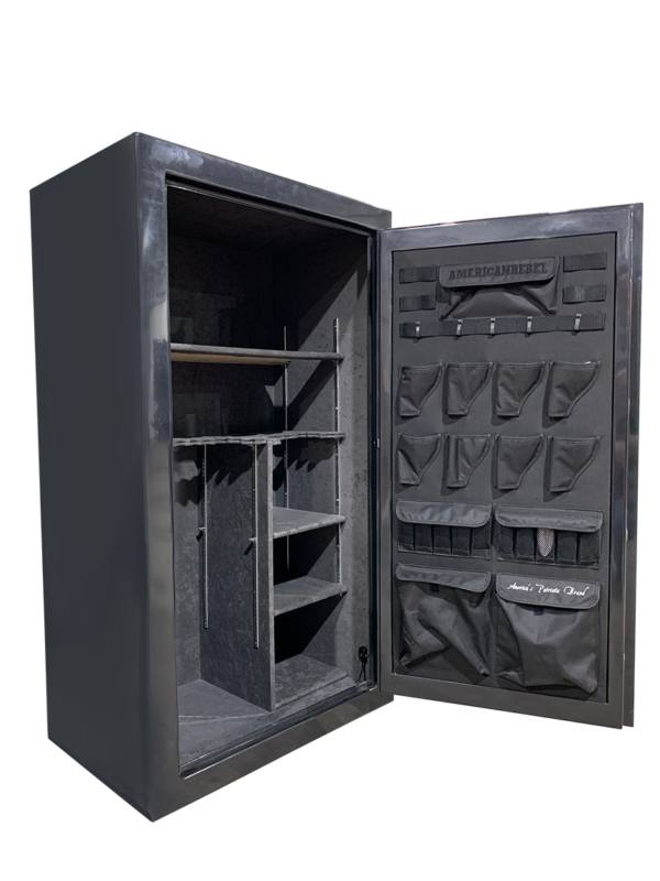 CLICK HERE to watch our video on “What to Do When Your Safe Arrives.”The American Rebel PT-30 Patriot 30 Gun Safe is perfect for those with many rifles, handguns, and other valuables that need protection. It has outside dimensions of 60.00" high by 34.00" wide by 24.50" deep. Remember to add 3" to the depth for the handle, lock, and hinges. The inside shelving features a top shelf to store your valuables. This shelf is adjustable up or down depending on your preferences. There is gun racking on the right side for your long rifles and three small shelves on the right, which can be adjusted. The door features a door organizer with three large pockets (one on top, two on bottom), two pockets for magazines, and eight pistol holsters to organize your pistols on the door.
