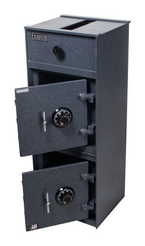 This Gardall RC1237CC double door depository safe features a B-Rating which means the body is 1/8" thick and the doors are made of 1/2" steel plate. This safe has two compartments. The top chamber is for money drops and the bottom is for storing cash trays. Other security features include an independent re-locker, anti fish baffle and laser cut door for exact fit. This is a great safe for mounting in delivery vehicles. There are mounting holes pre-drilled into the bottom of the safe for anchoring to the floor which is highly recommended.