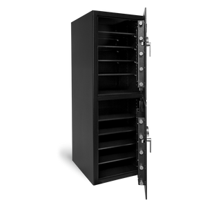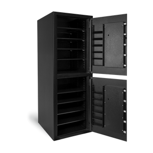 The Pacific Safe UC722527TB Inventory Control Double Door B-Rate Burglary Safe allows your business to separate valuable inventory such as cell phones, tablets, and narcotics into two compartments. The upper section has five adjustable shelves for organization. This ensures that only authorized personnel have access. Meanwhile, the lower compartment has five adjustable shelves and provides a secure enclosure for cash trays, spare change, and other valuable items that demand protection. Each door has rolled coin holders for extra storage.