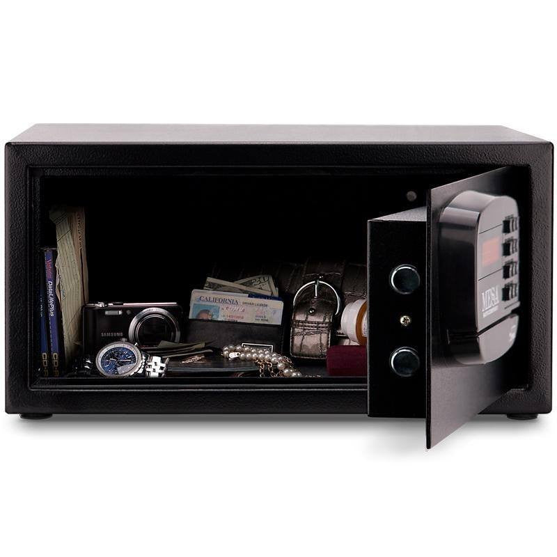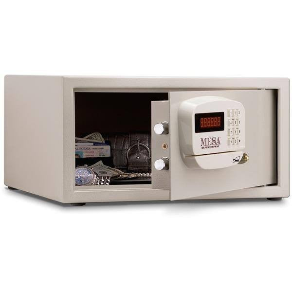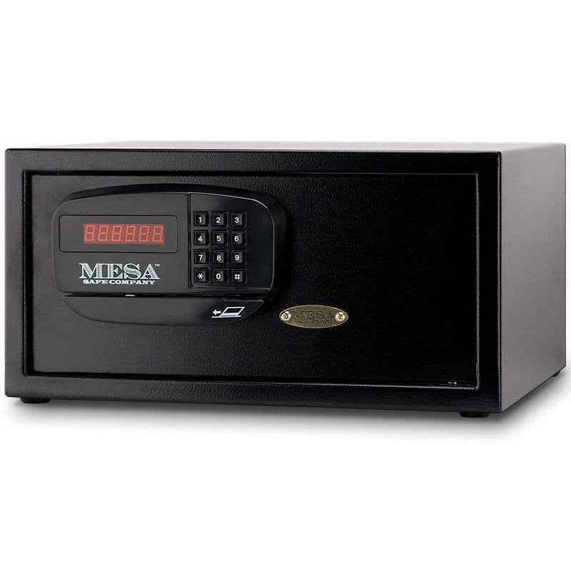 CLICK HERE to watch our video on “What to Do When Your Safe Arrives.”The Mesa MHRC916E Hotel Safe is designed to offer security and user-friendly functionality, making it the ideal choice for hotels, guest rooms, or personal use. With a 1/4" thick steel door and a 1/8" high-strength all-steel body, this safe provides superior protection against tampering and theft. Its pry-resistant recessed door and concealed steel hinges further enhance its durability, making it a reliable safeguard for valuables. Inside, a spacious 1.15 cubic foot interior with a removable carpet ensures ample room to store items without worry about scratches or damage.