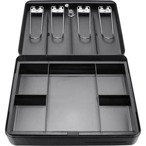 If you need a place to store cash transactions on the go, consider the Barska CB13052 12" Standard Fold Out Cash Box with Key Lock. The coin trays are separated into 4 sections and lifts up to reveal more storage space underneath. This space underneath could be used for excess large bills that you want to keep hidden. There is room in the middle of the coin compartments for miscellaneous items. On the top of the lid are the spring-loaded bill compartments where you can store different denominations.