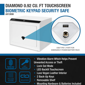 CLICK HERE to watch our video on “What to Do When Your Safe Arrives.”The Barska AX139389 Diamond Touchscreen Biometric Keypad Security Safe combines modern technology with elegant design, offering advanced security for your valuables. Constructed with a solid 2mm steel body and a 4mm steel door, this safe is built to resist tampering while ensuring long-lasting durability. Equipped with motorized deadbolts and a biometric scanner that stores up to 100 fingerprint scans and 10 PIN codes, it provides quick and secure access. A 30-second vibration alarm activates if the safe is struck or shaken, and the lockout mode prevents unauthorized entry after too many failed attempts, ensuring maximum protection.
